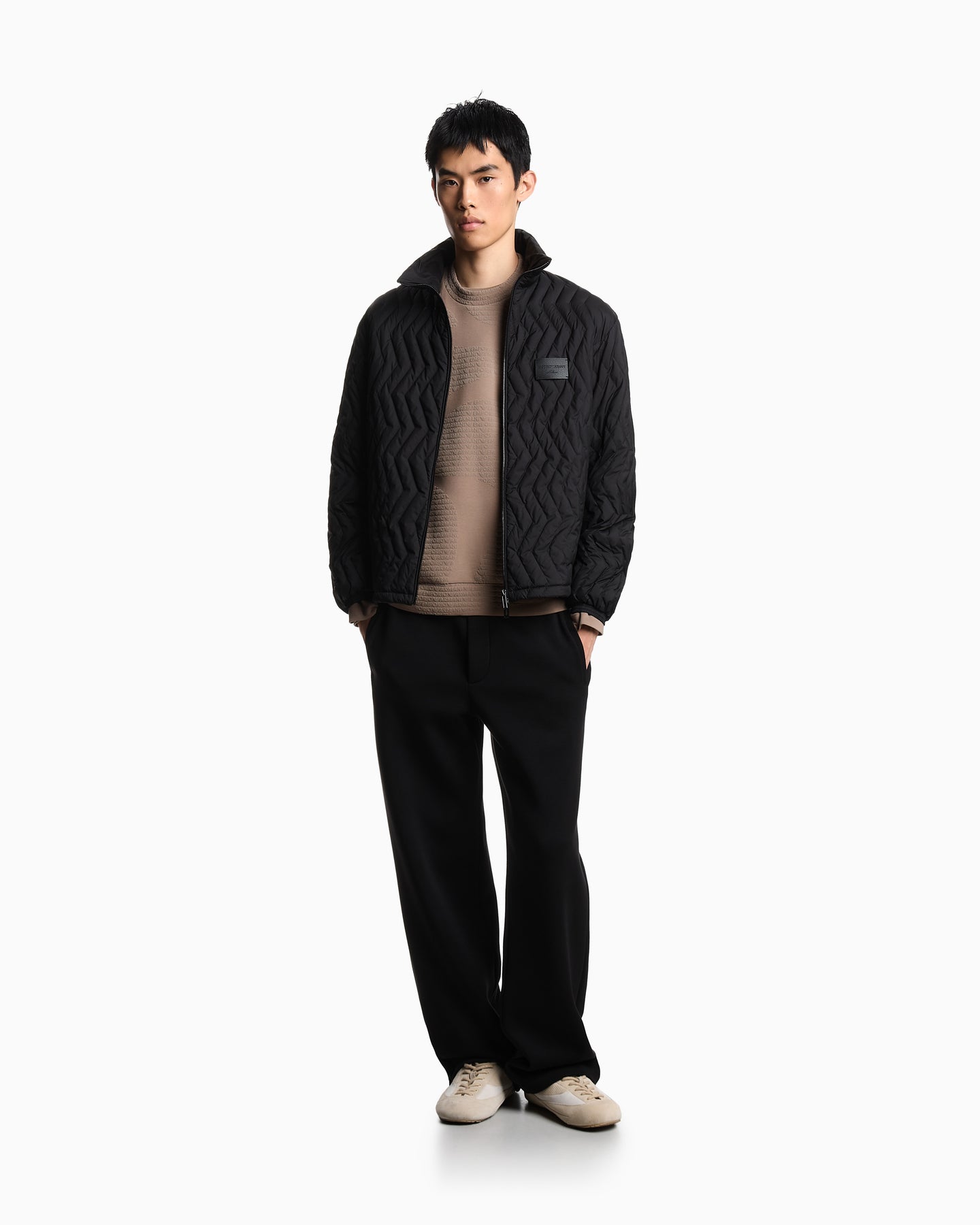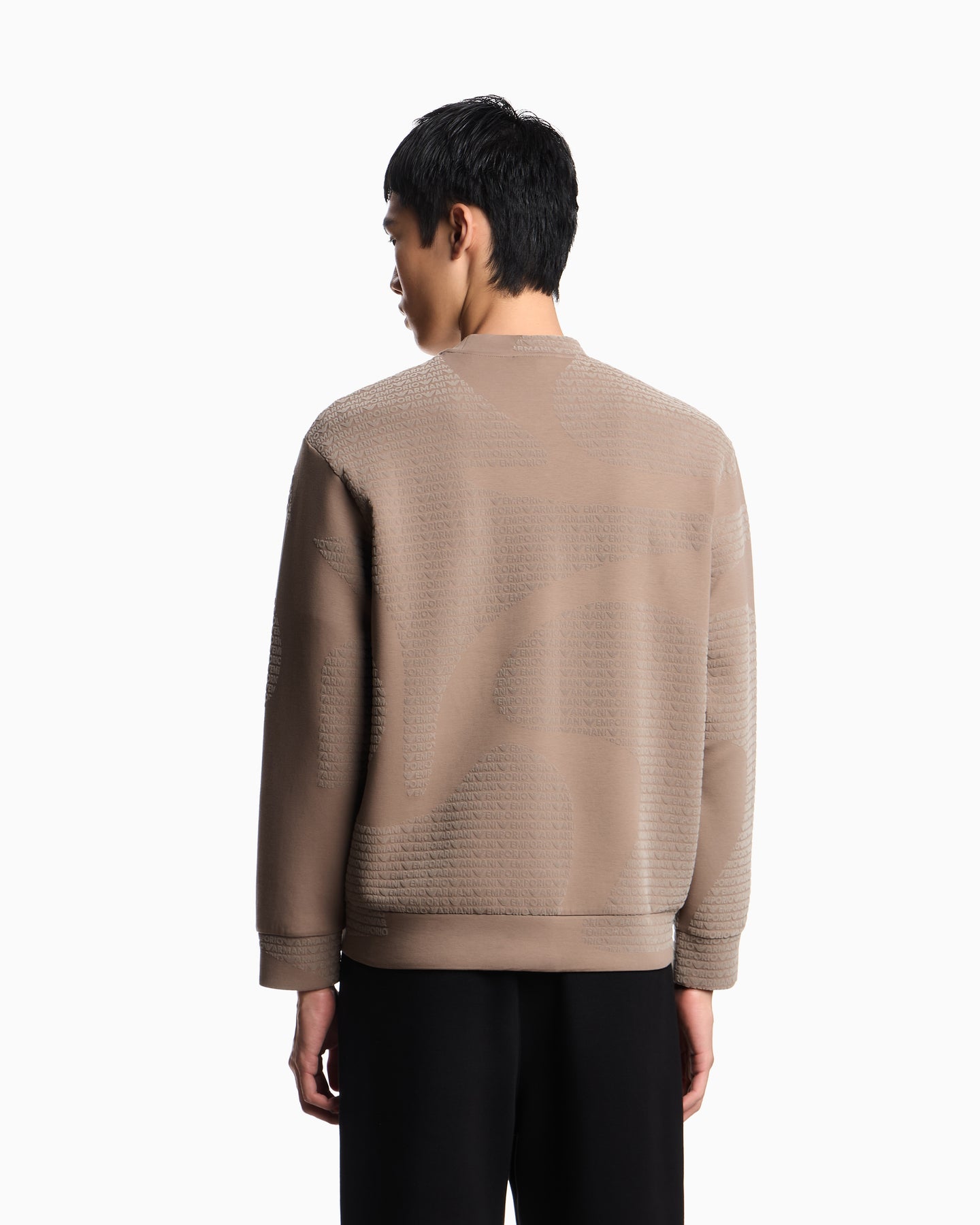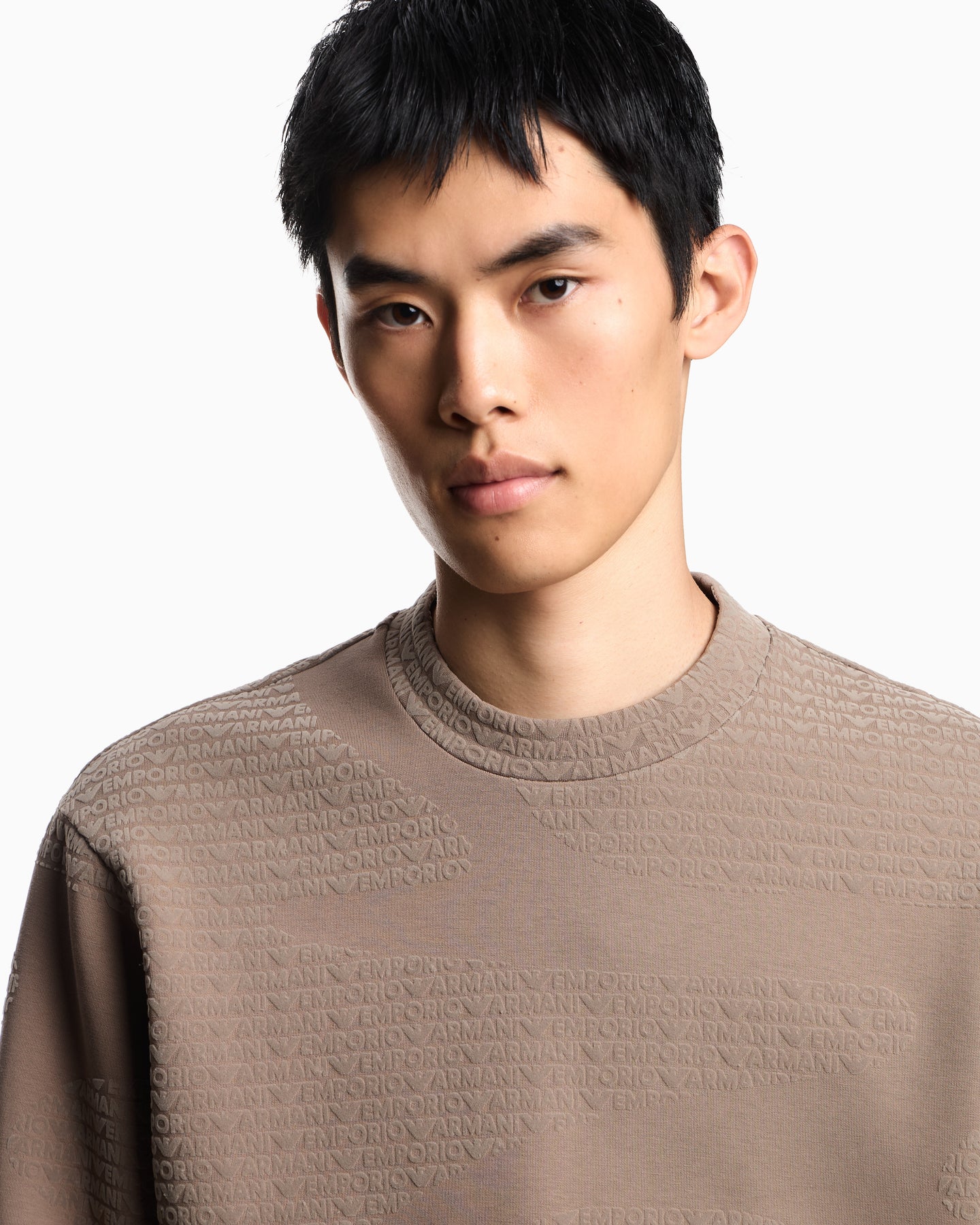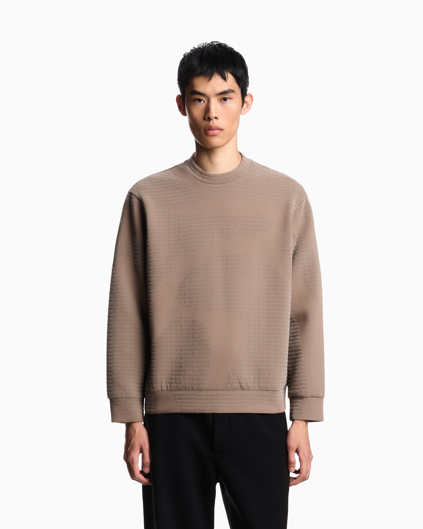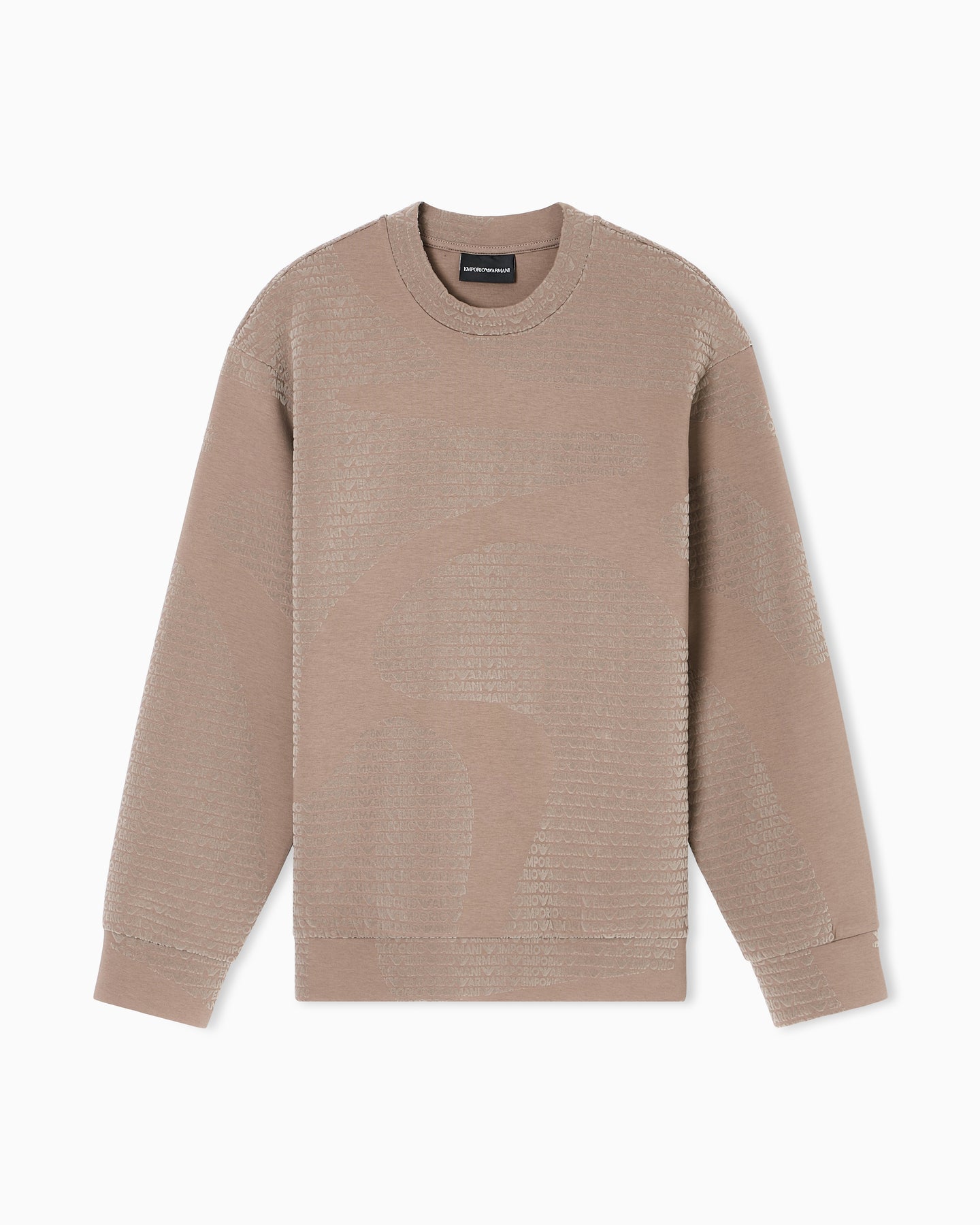 Regular price $420.00A standout piece from Emporio Armani, this premium sweatshirt is crafted from a soft cotton-blend jersey and finished with an all-over flocked logo pattern. The dense, velvety flocking gives the fabric a raised, embossed feel, adding texture and depth to the rich Walnut Fancy colourway. Designed with a classic crew neckline and long sleeves, it delivers elevated comfort and everyday luxury.