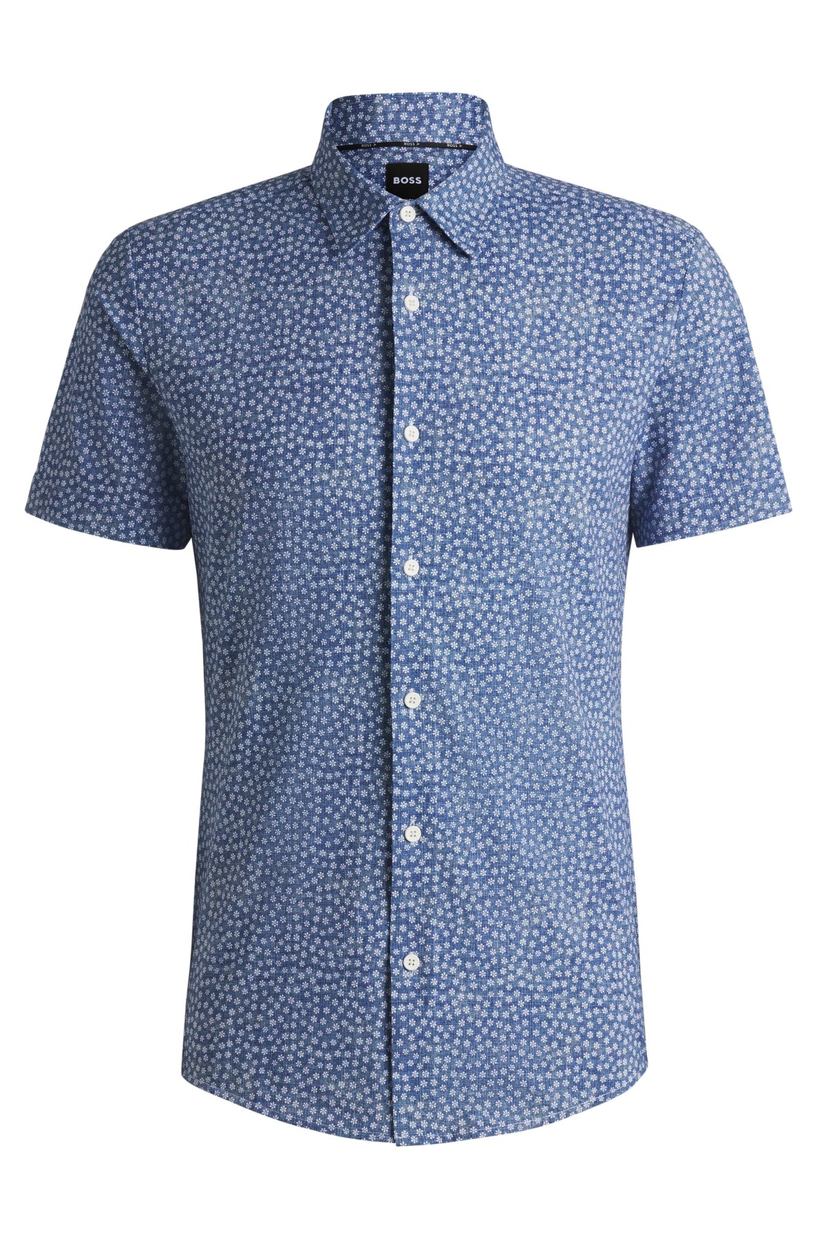 Regular price $350.00Designed for warm days and sharp styling, this BOSS short-sleeve shirt is crafted in Italian-made performance fabric with a refined floral print. Cut to a slim fit, it offers exceptional stretch, breathability and moisture management to keep you cool and comfortable throughout the day. Finished with a classic Kent collar and clean round cuffs, it’s an elevated option for both smart-casual and summer occasions.