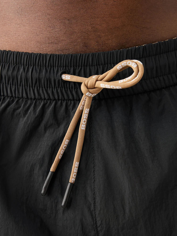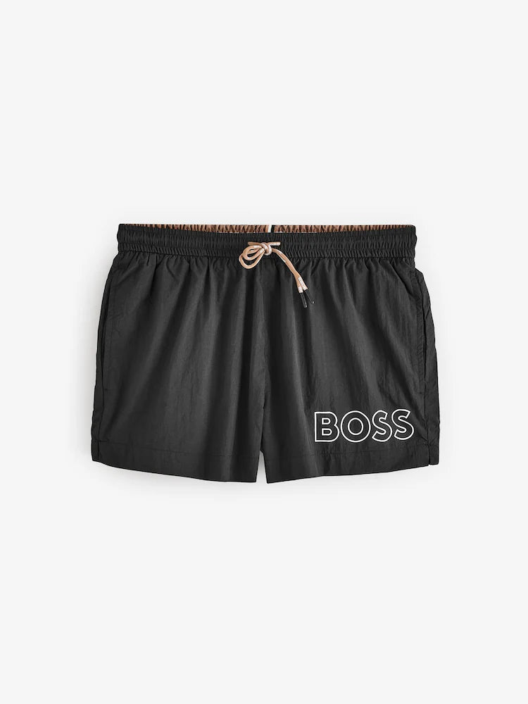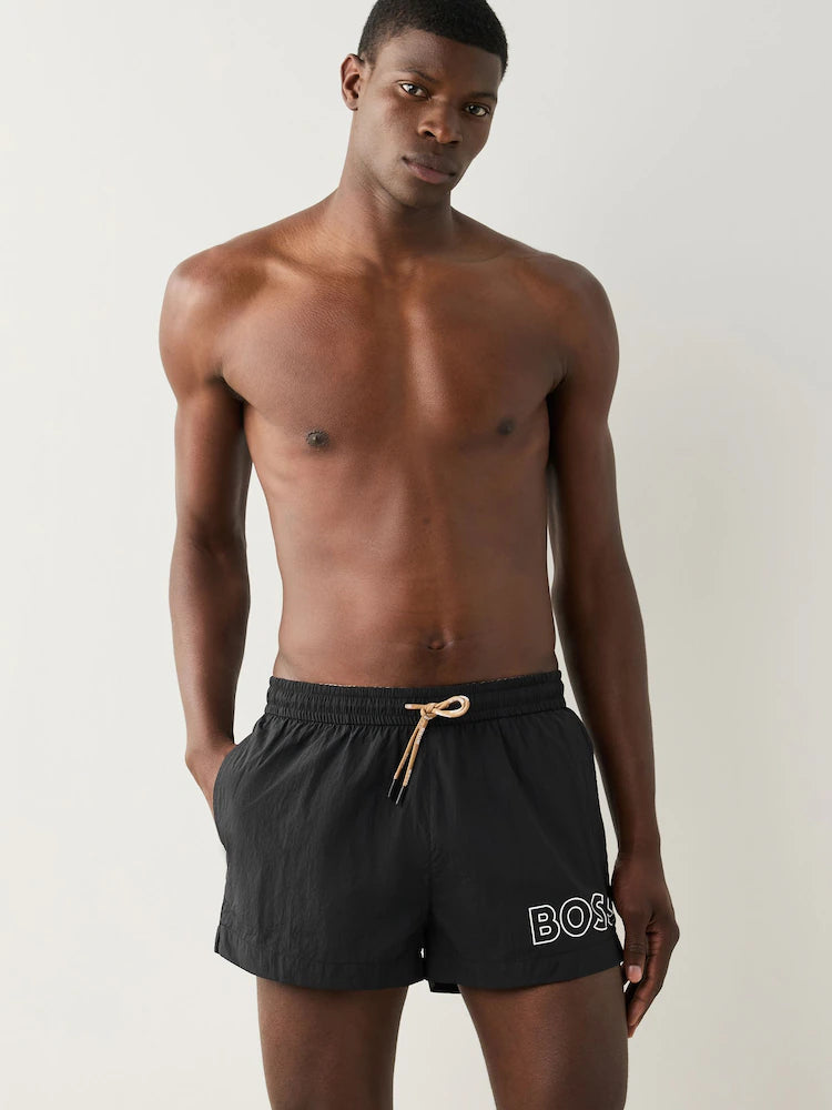 Regular price $99.00Modern swim shorts in quick-drying fabric by BOSS. Fully lined for comfort, these sporty swim shorts feature a large outlined BOSS logo printed on the left leg. Finished with gold-tipped drawcords for a touch of contrast and subtle branding detail.