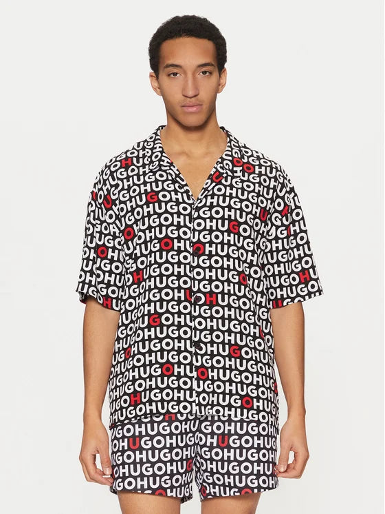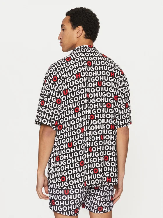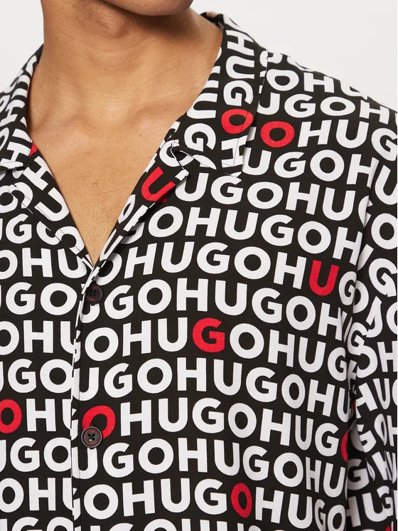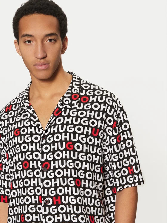 Elevate your casual wardrobe with this bold short-sleeve shirt by HUGO. Crafted in a lightweight fabric, this shirt features an all-over logo pattern in a striking mix of black, white, and red, making it a standout piece for any modern look.