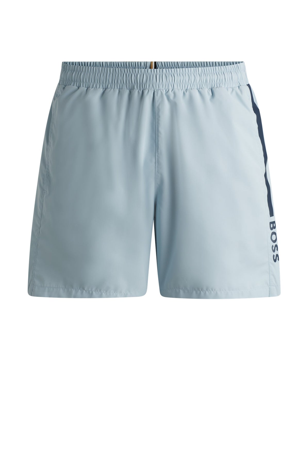 Hidden-drawcord swim shorts with full lining by BOSS. This straight-leg pair is printed with a logo on the left leg for signature appeal. This product is partly created with polyester.