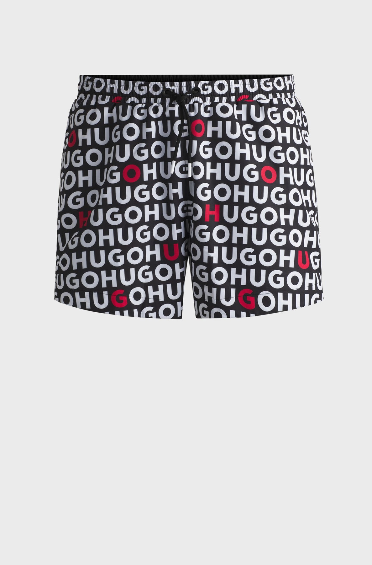 Fully lined swim shorts with repeat logos printed all over by HUGO. As part of our CLEAN UP YOUR ACT initiative, this product is made with at least 60% better raw materials. This product is made from at least 60% recycled polyester. Recycled polyester is an artificial fibre made from oil-based waste such as old PET bottles.